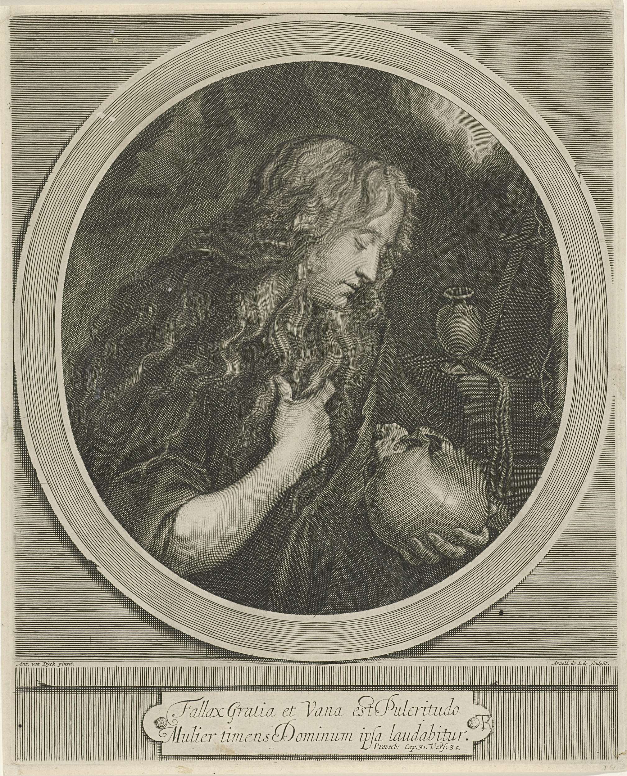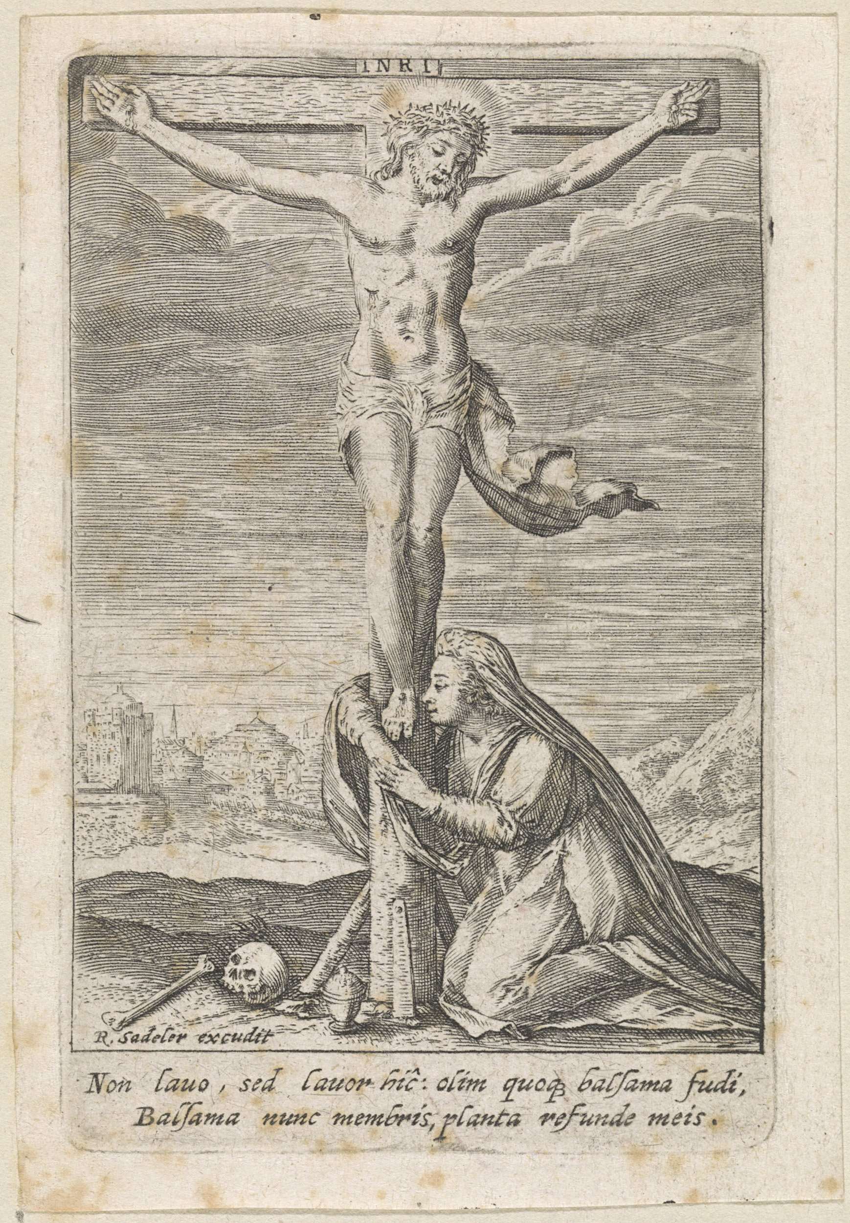 Maria Magdalena geknield bij de gekruisigde Christus