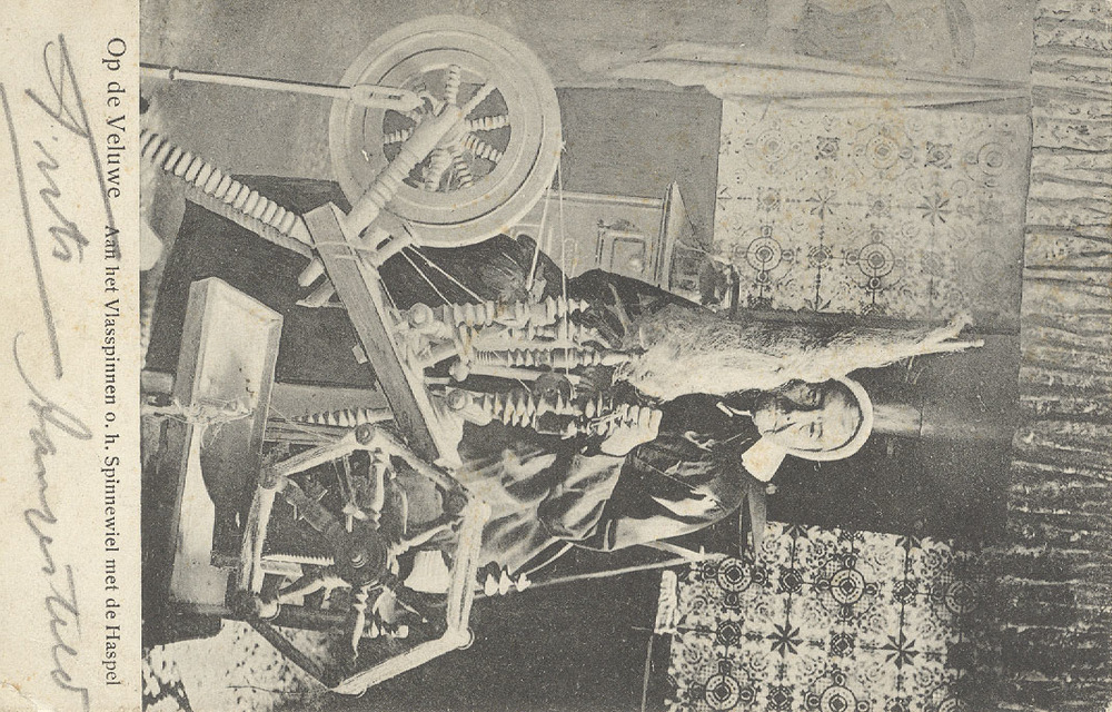 Op de Veluwe. Aan het vlasspinnen o.h. Spinnewiel me...