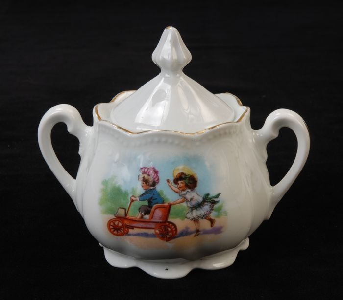 Witte theepot met goudkleurige randen, bloemen en "T...
