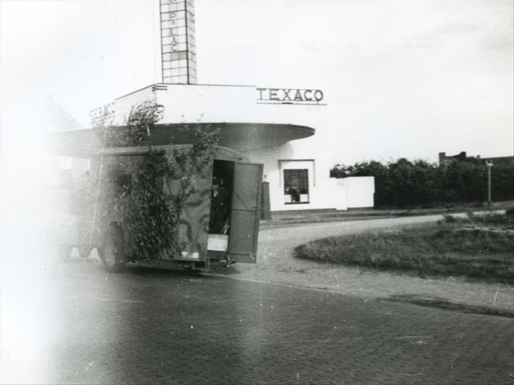 Duitse militaire achter tafel bij tent en vrachtwagen