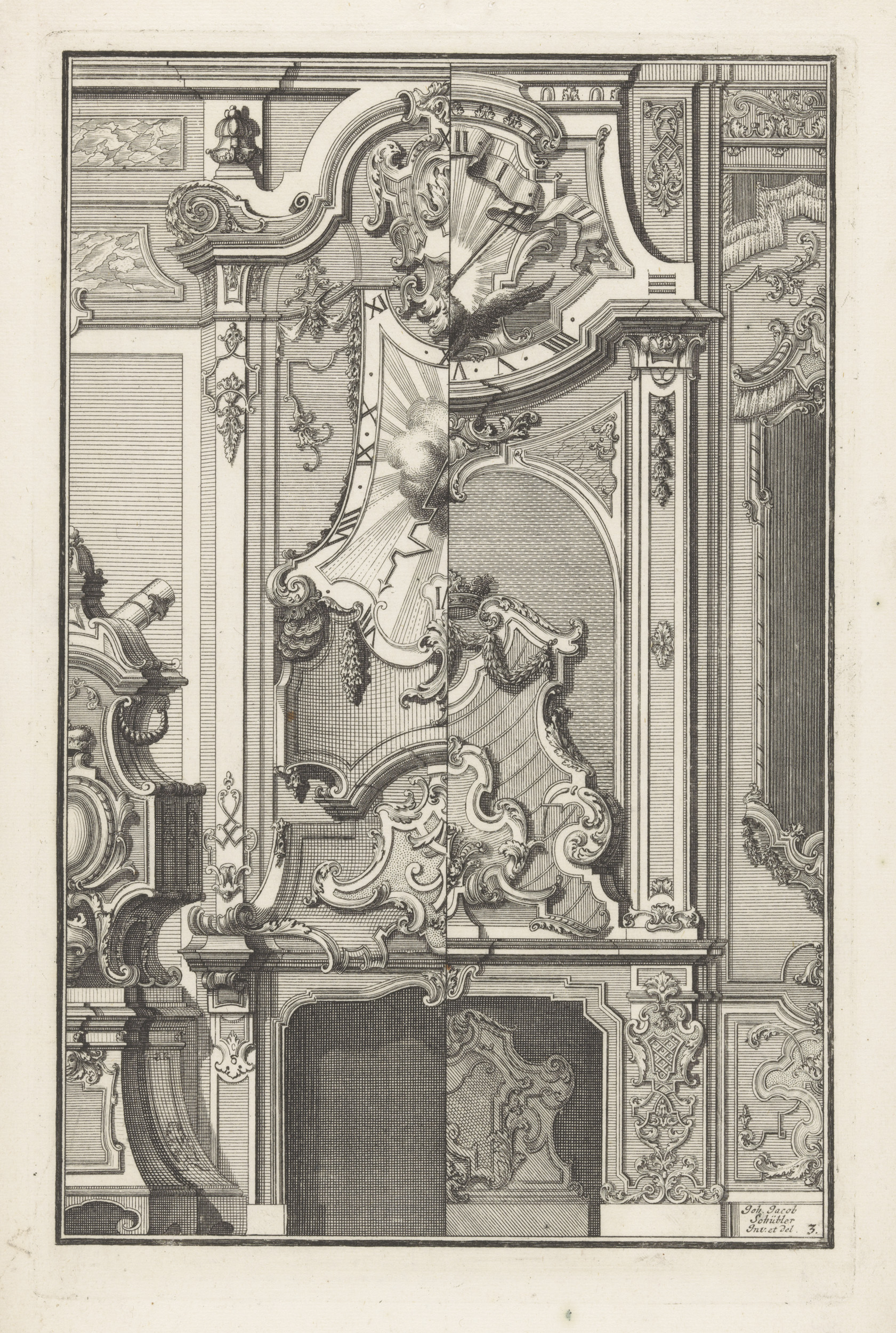 Cartouche met onderaan en bovenaan een masker