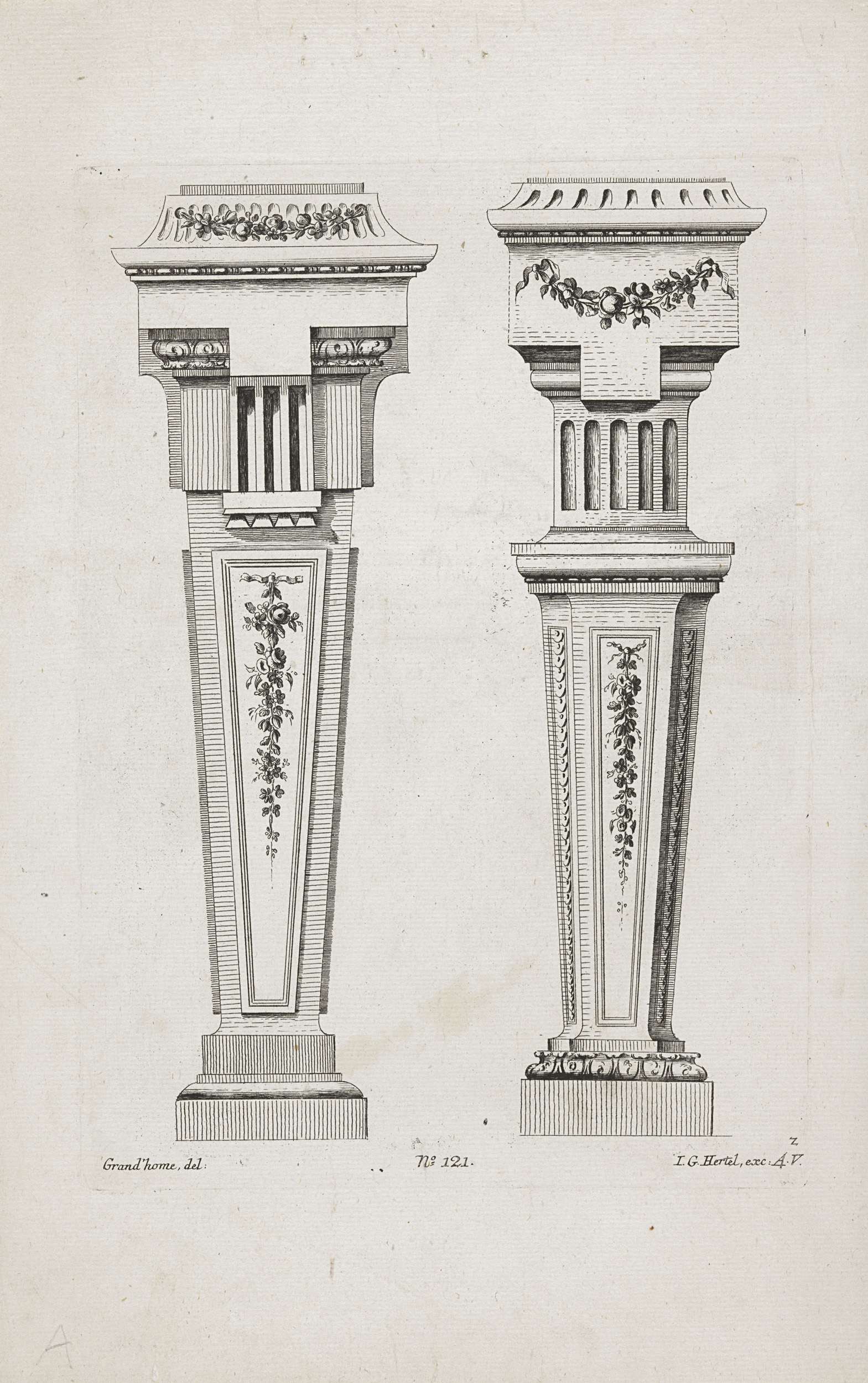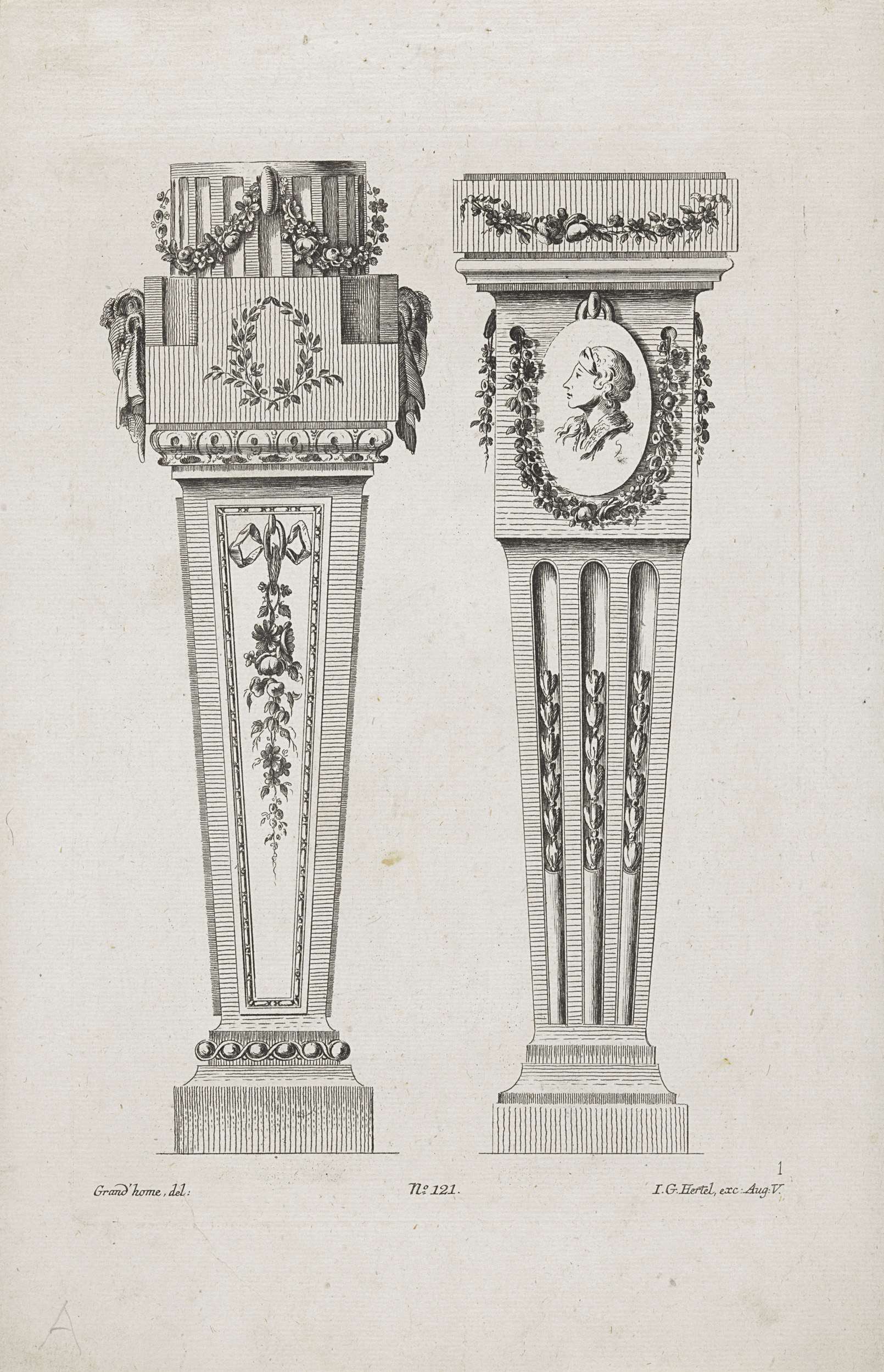 Twee voetstukken met lauwerkrans en medaillon