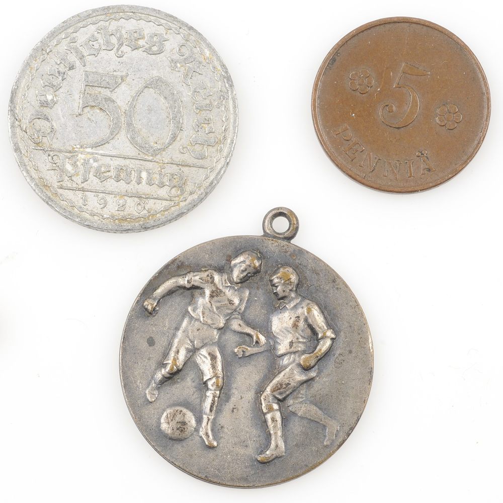 twee munten en een medaille: 50pf. 1 pennia