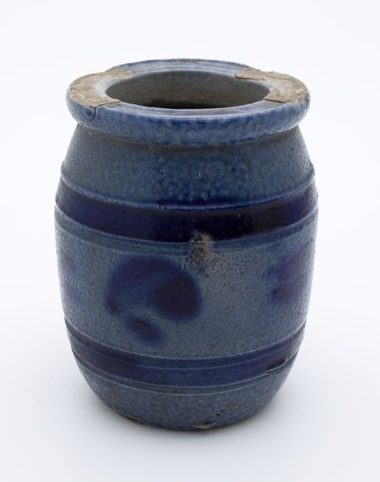 Kleine steengoed mosterdpot met blauwe banden