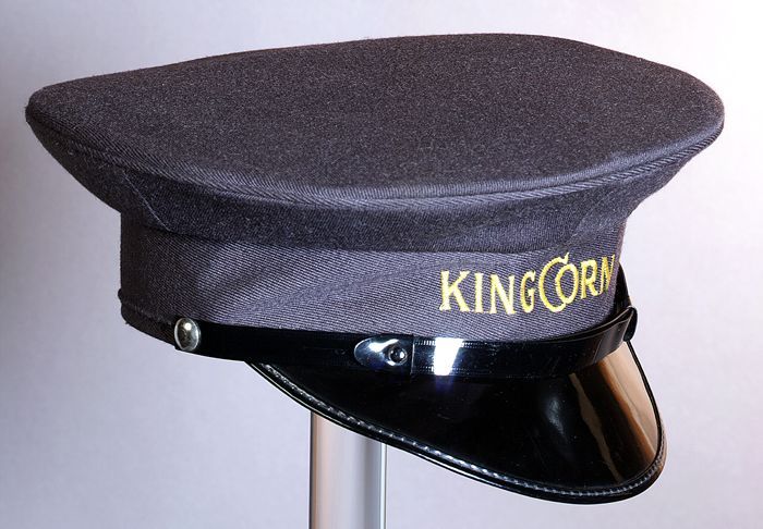 Grijze platte herenpet, onderdeel uniform, "King Corn"