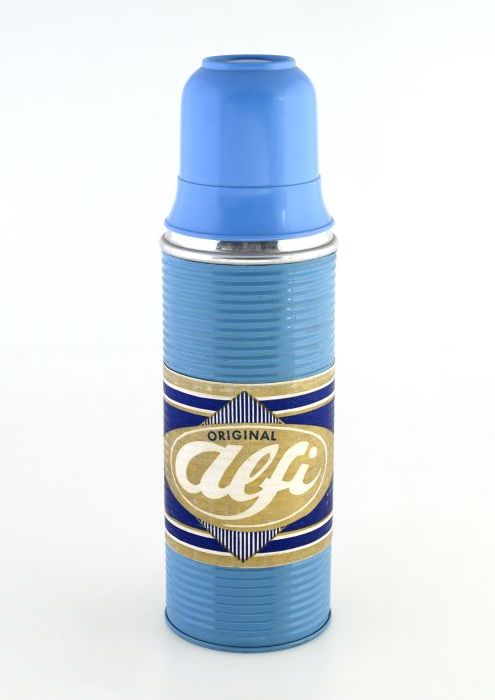 Oranje cilindrisch cacaoblik, met "Cacao, C.J. Van H...