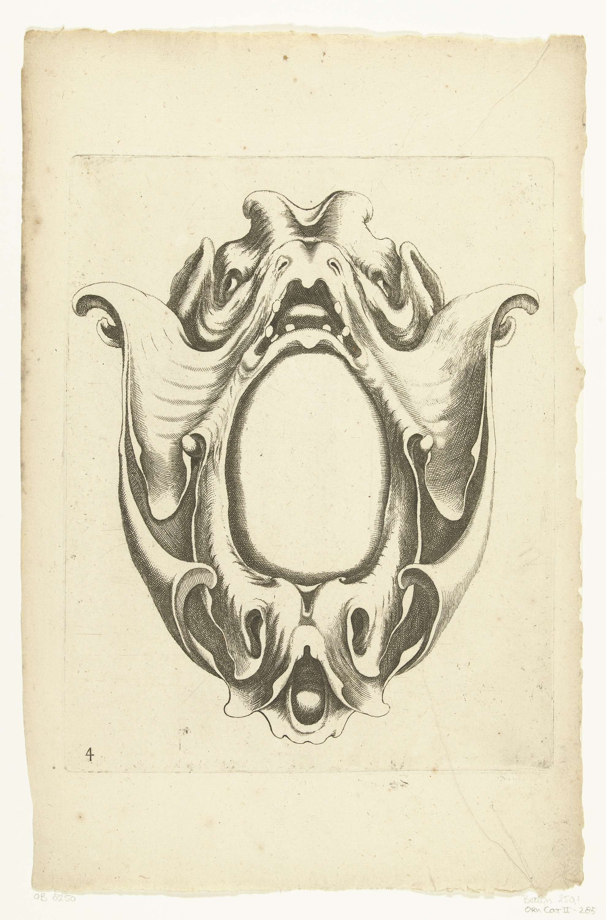 Cartouche met masker met gapende bek
