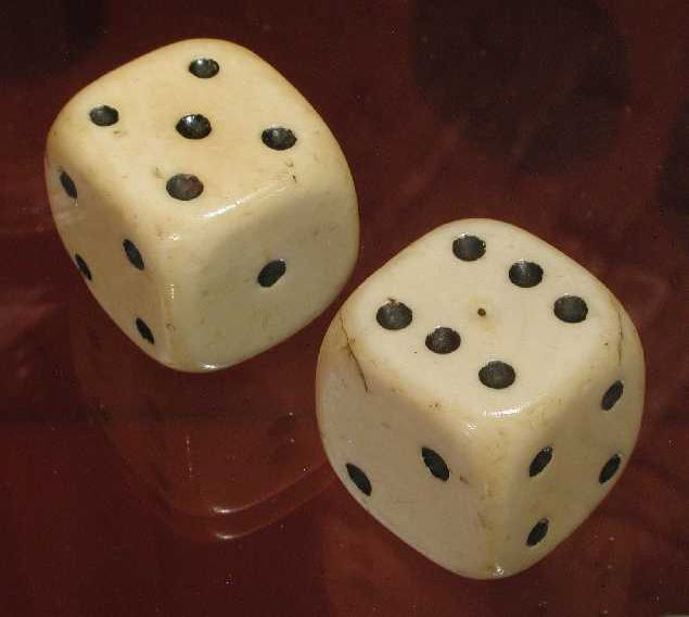 Twee grote dobbelstenen, gebruikt door zakkendragers...