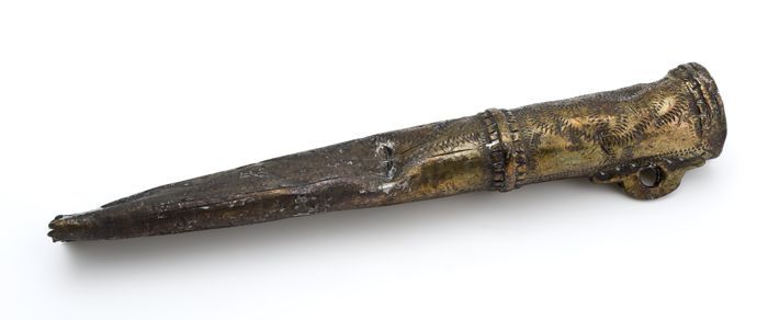 Koperen messchede of foedraal met oog, in reliëf ver...