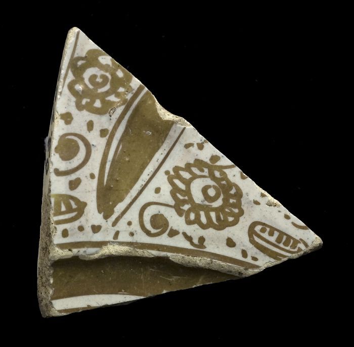 Scherf van majolica schotel met goudlusterversiering...