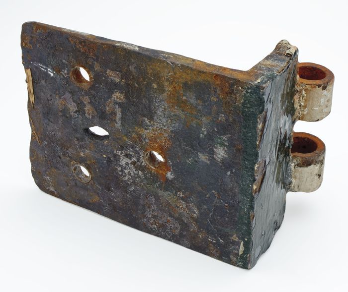 Helft van rechthoekige koperen grafplaat of kistplaa...