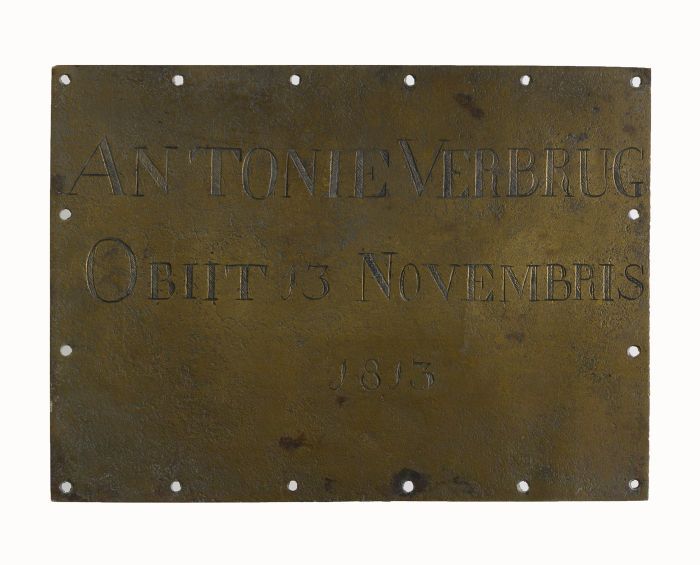 Rechthoekige koperen grafplaat of kistplaat van "Ant...