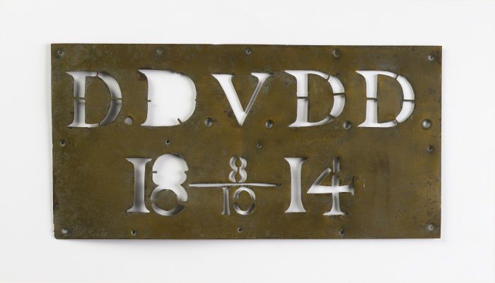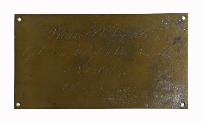 Rechthoekige koperen grafplaat of kistplaat van "vro...