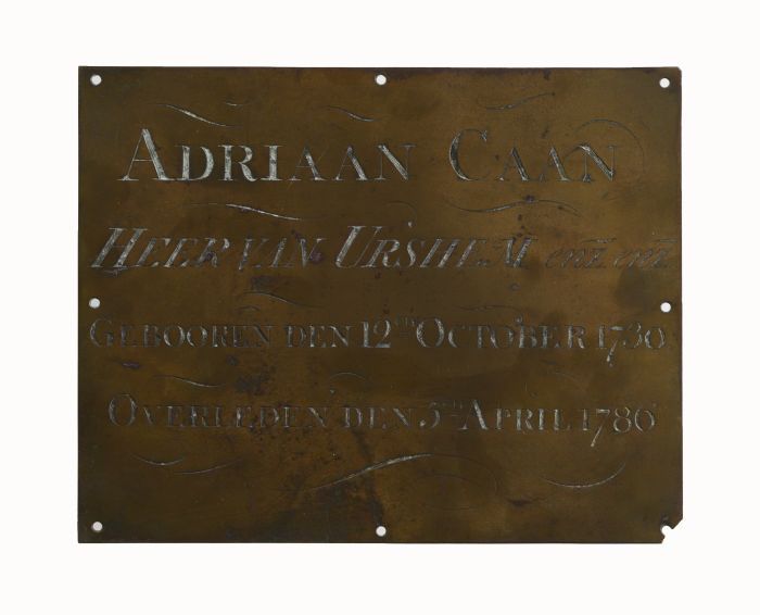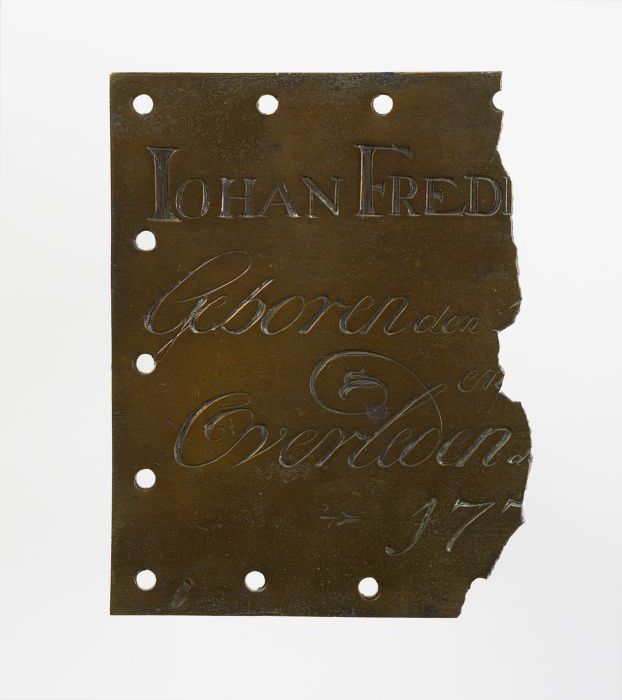 Rechthoekige koperen grafplaat of kistplaat waaruit ...