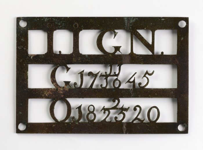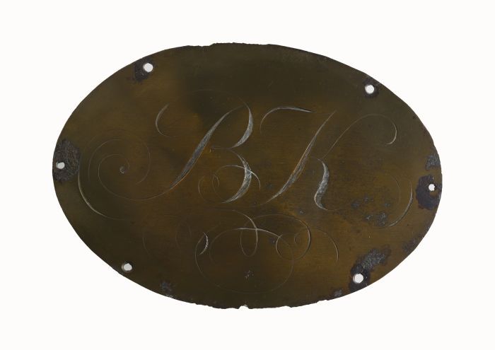 Ovalen koperen grafplaat of kistplaat "BK", afkomsti...