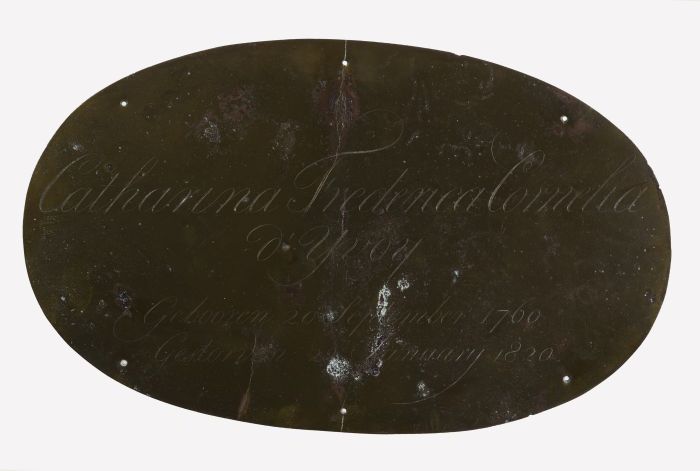 Ovale koperen grafplaat of kistplaat van "Catharina ...