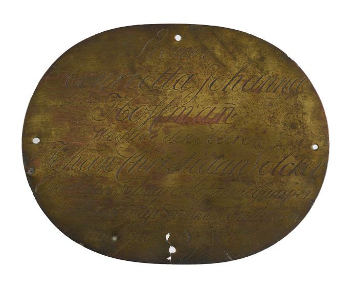 Ovalen koperen grafplaat of kistplaat van "Vrouwe He...