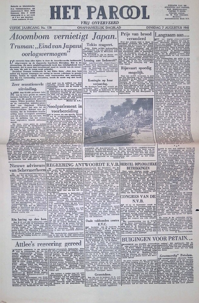 Het Parool, 7 augustus 1945, 5e Jaargang, No 178