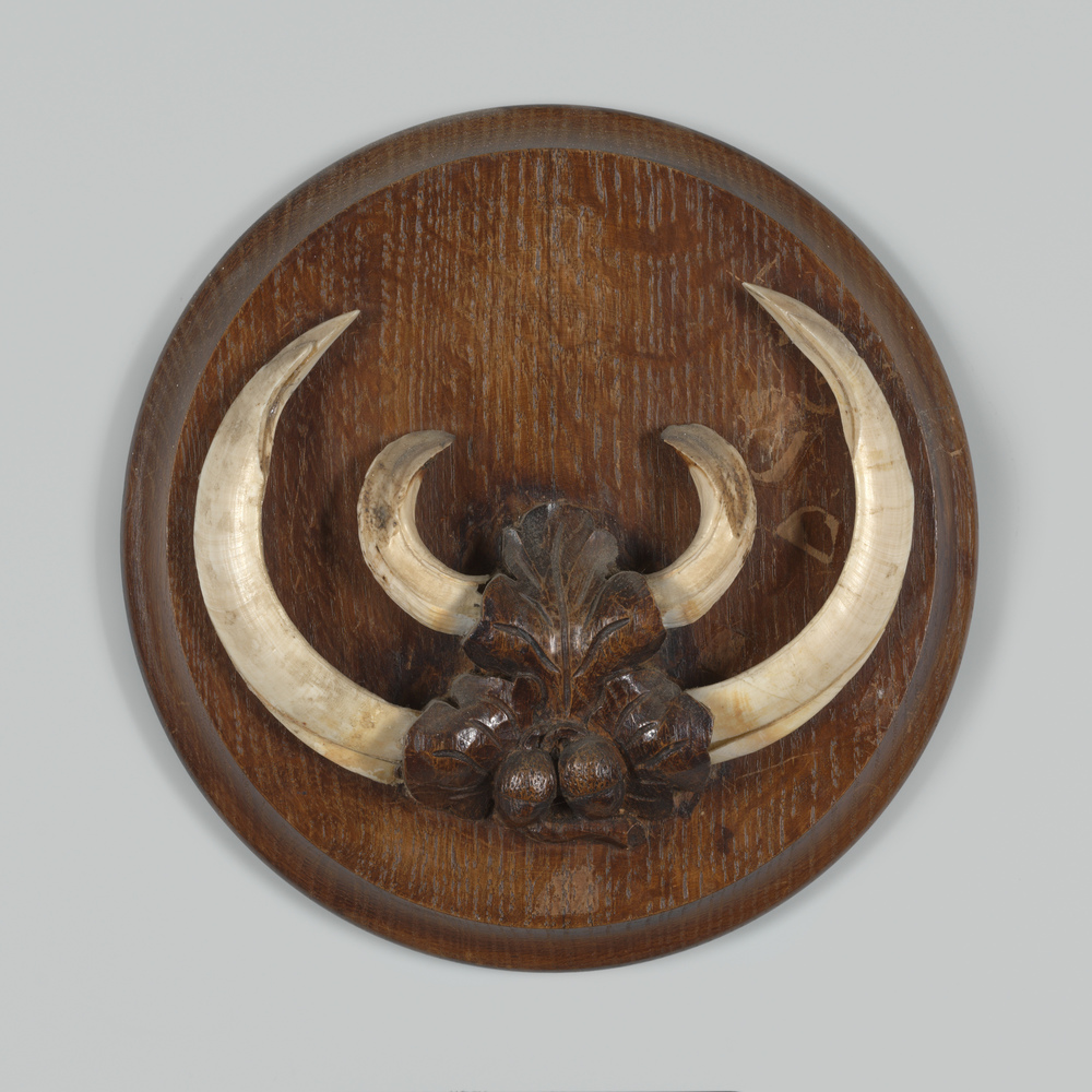 Everzwijntanden op een houten schild