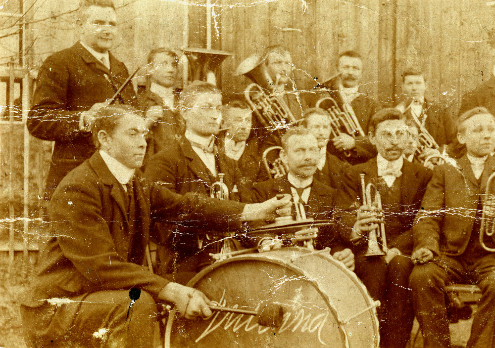 Zwart-wit foto van de muziekvereniging Juliana te Lo...