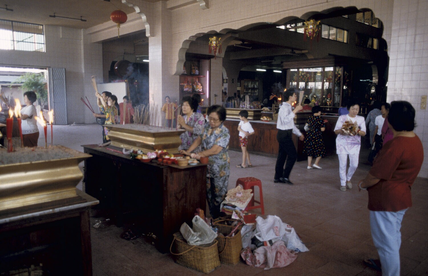 'Sumatra, Medan Interieur chinese tempel; vrouw is b...