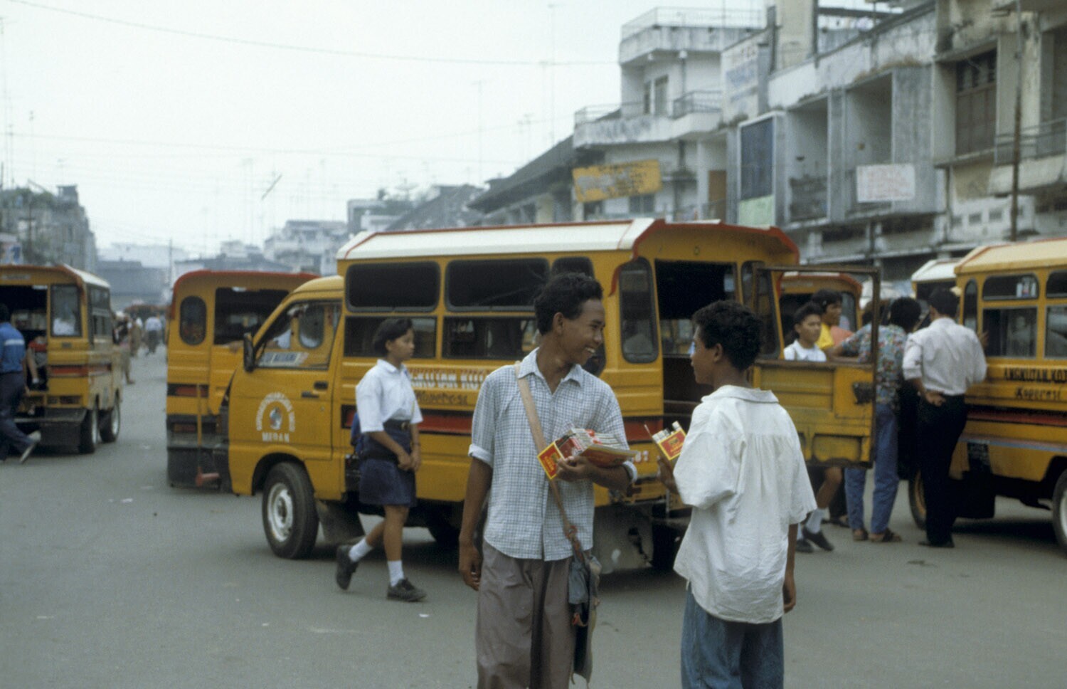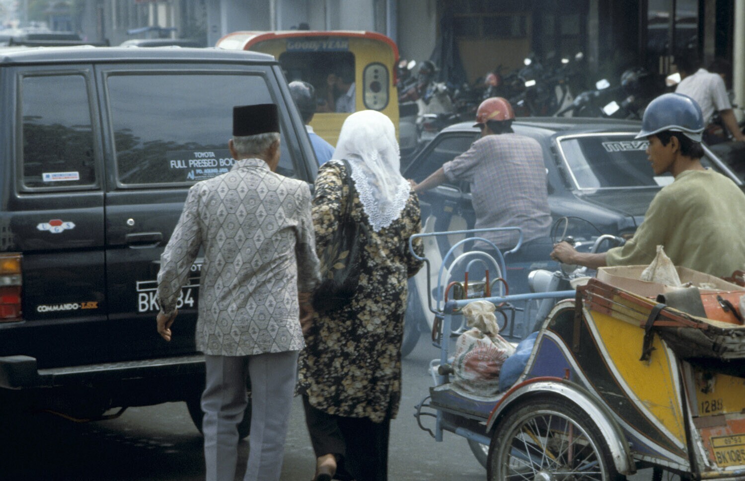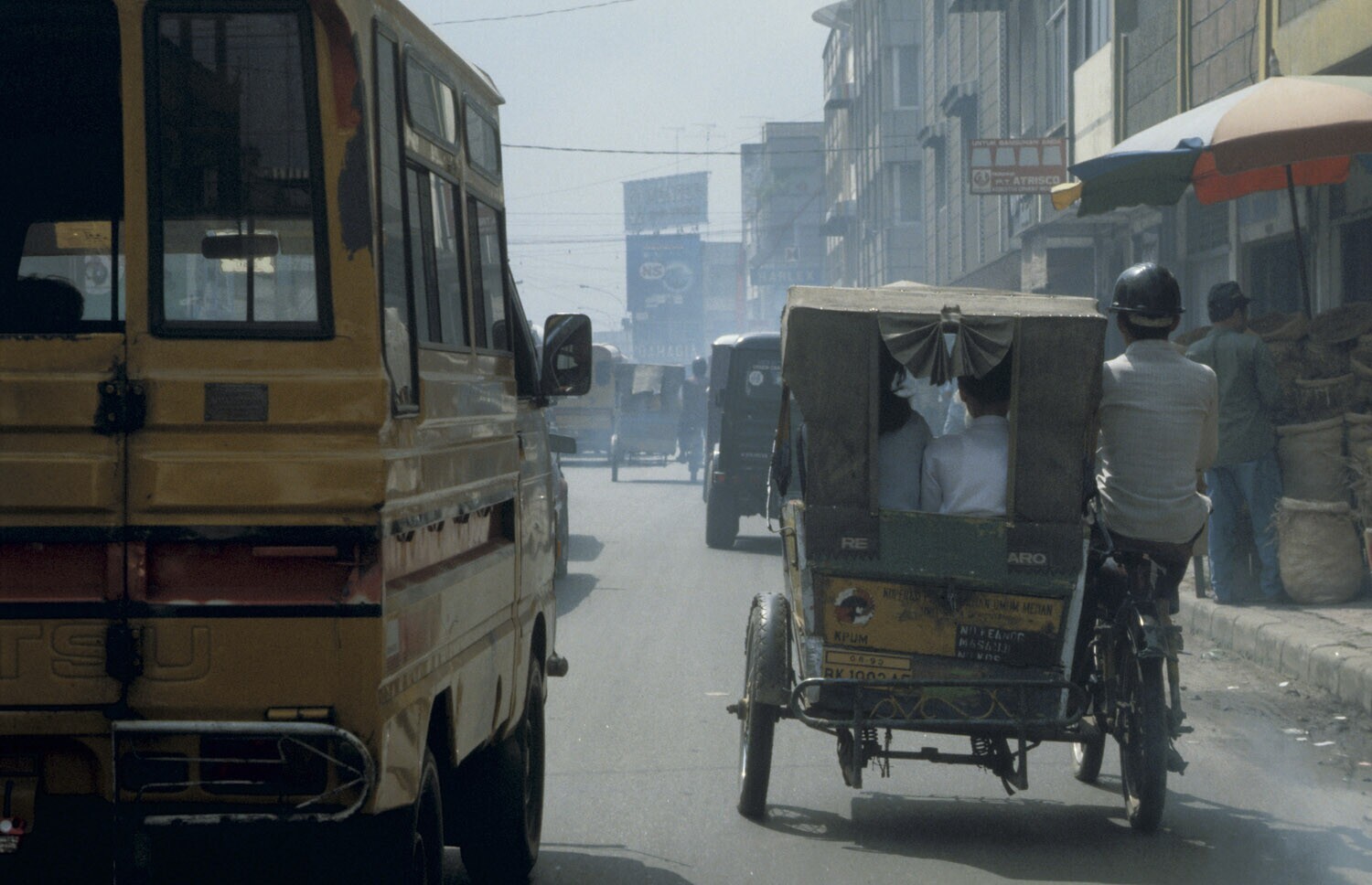 Sumatra, Medan. Straatbeeld met verkeersdrukte, oa. ...