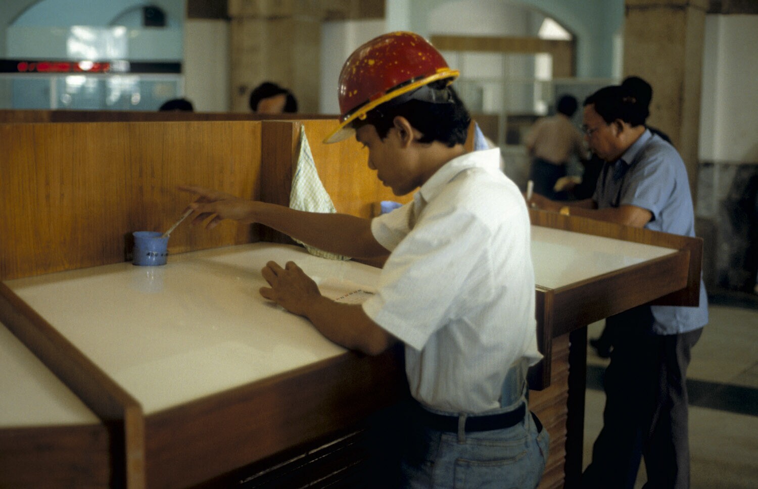 Sumatra, Medan Interieur van het postkantoor. Close ...