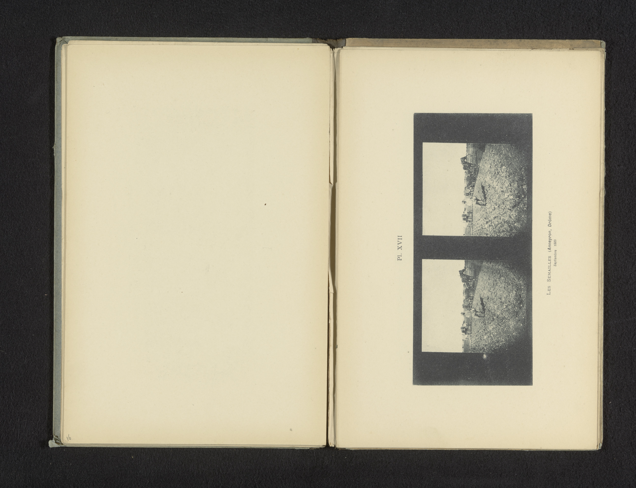 Stereofoto van een boer die het land zaait