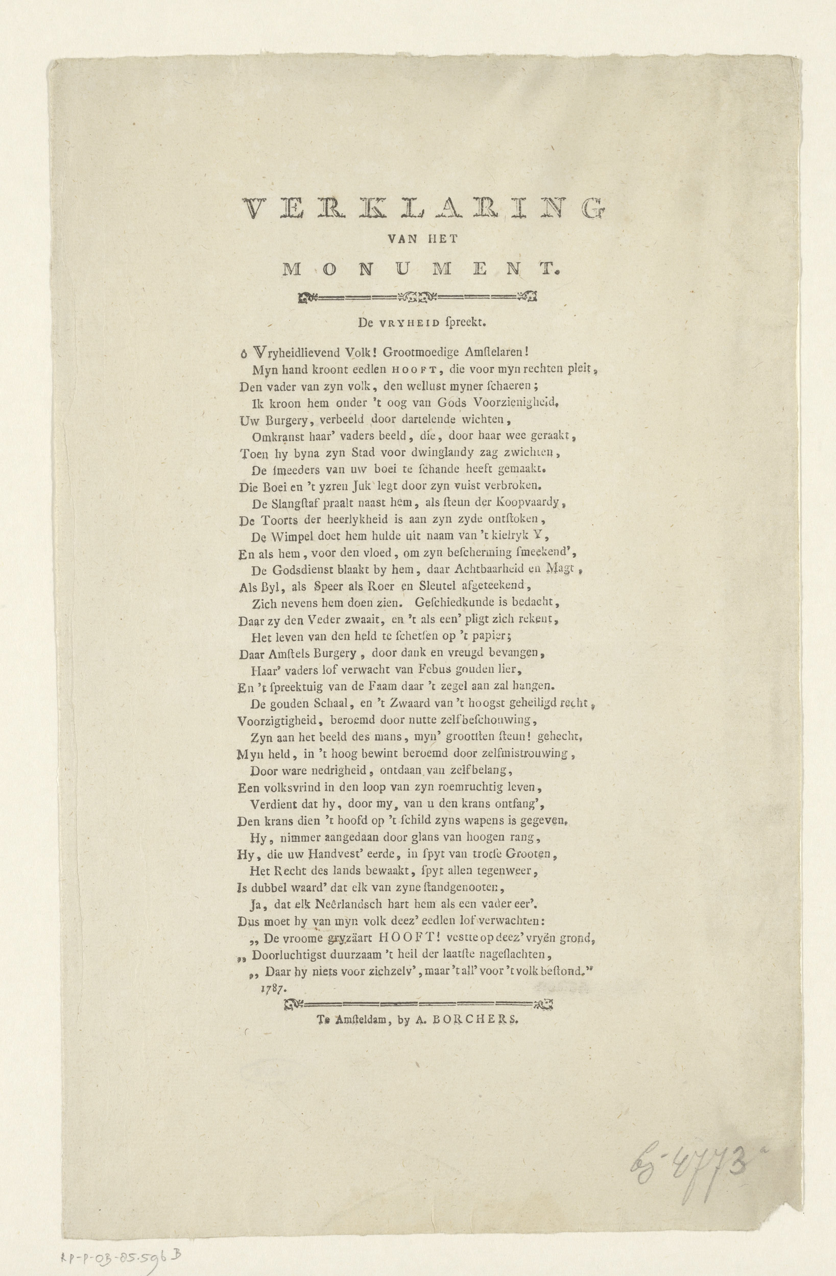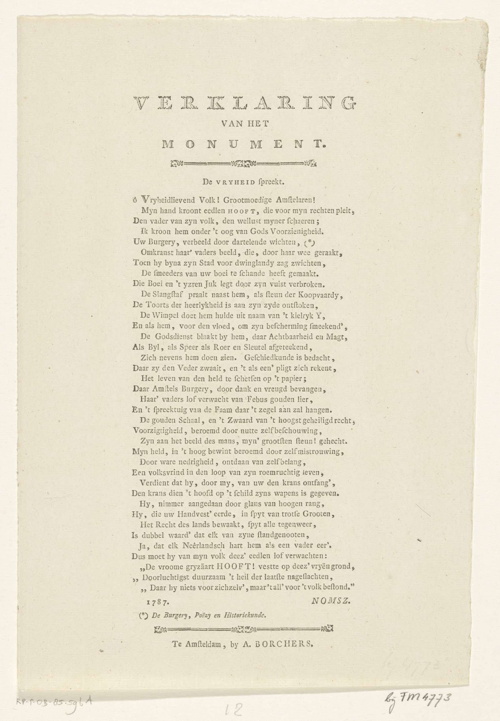 Toejuiching van Hendrik Danielsz. Hooft op de Dam, 1787