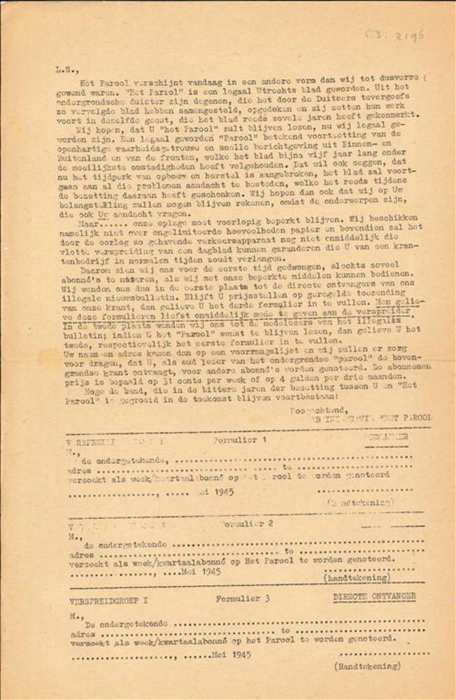 Pamflet, folio, Oproep om abonnee op Het Parool te w...