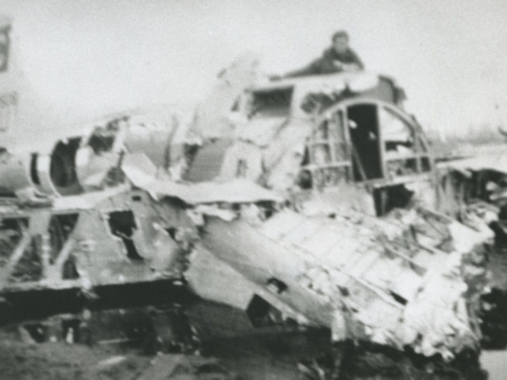 Foto van wrak Boeing B-17 met persoon op de romp.