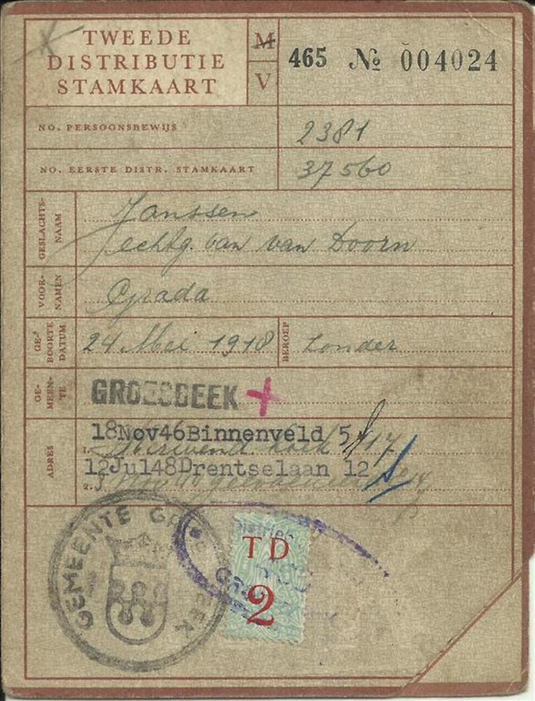 Tweede Distributiestamkaart op naam van Grada Janssen