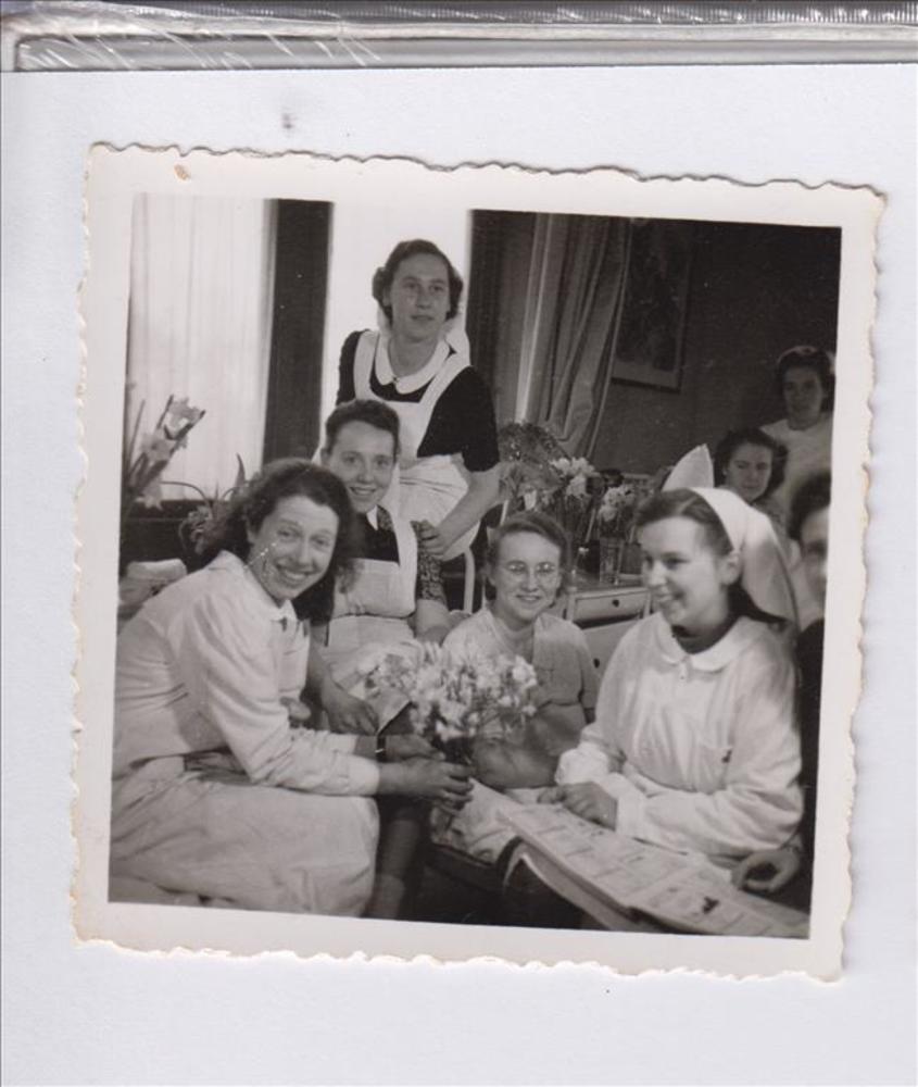 Foto van enkele verpleegsters met een bos bloemen