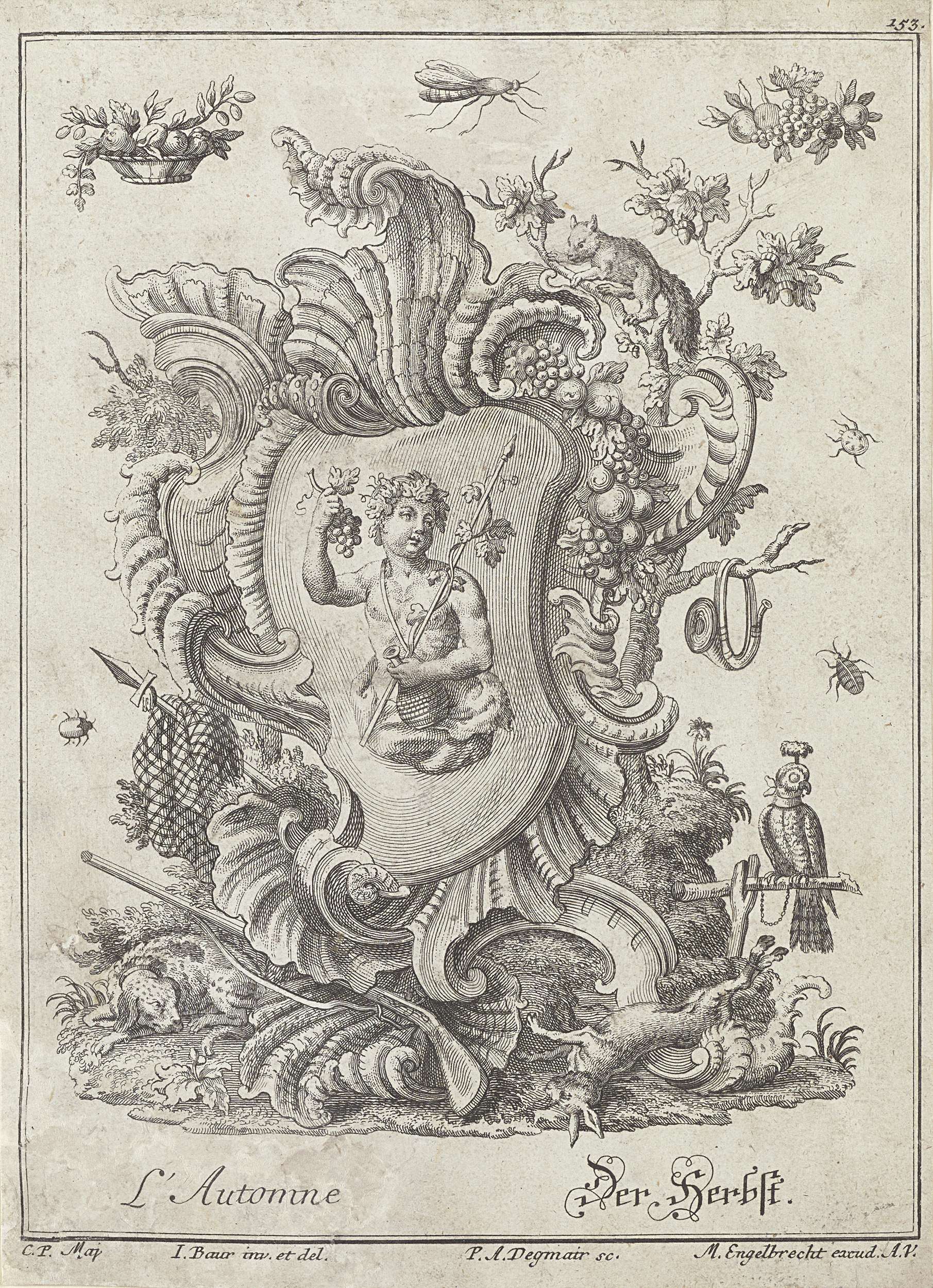 Jonge man met druiven en thyrsus op een rocaille