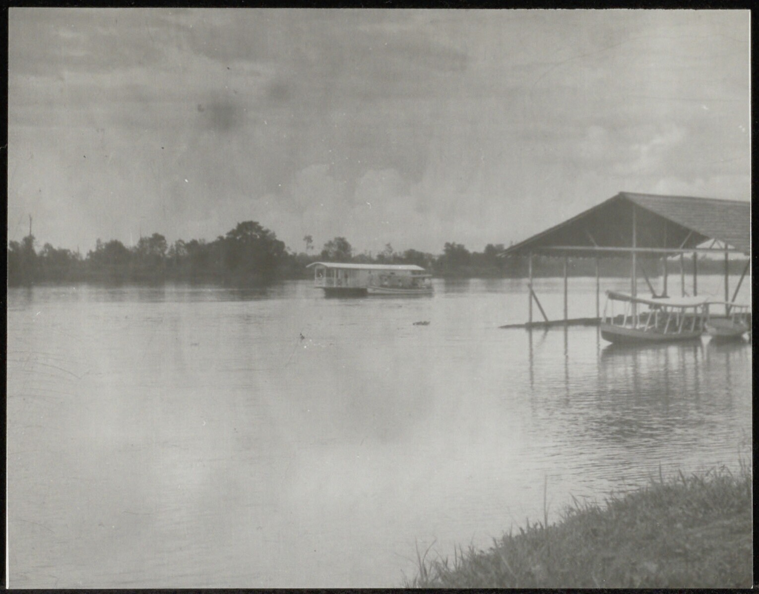 Prauwen varend langs de oever van de Kapuas-rivier i...