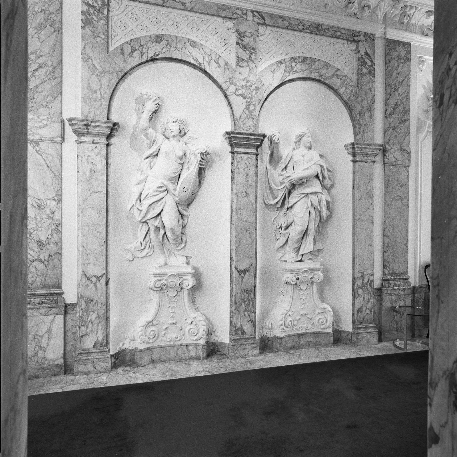 Interieur, STUCWERK (BEELDEN) TEGENOVER DE TRAP