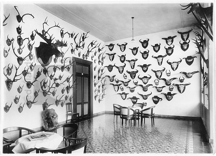 Interieur met jachttrofeën aan de wand, Java, Indone...