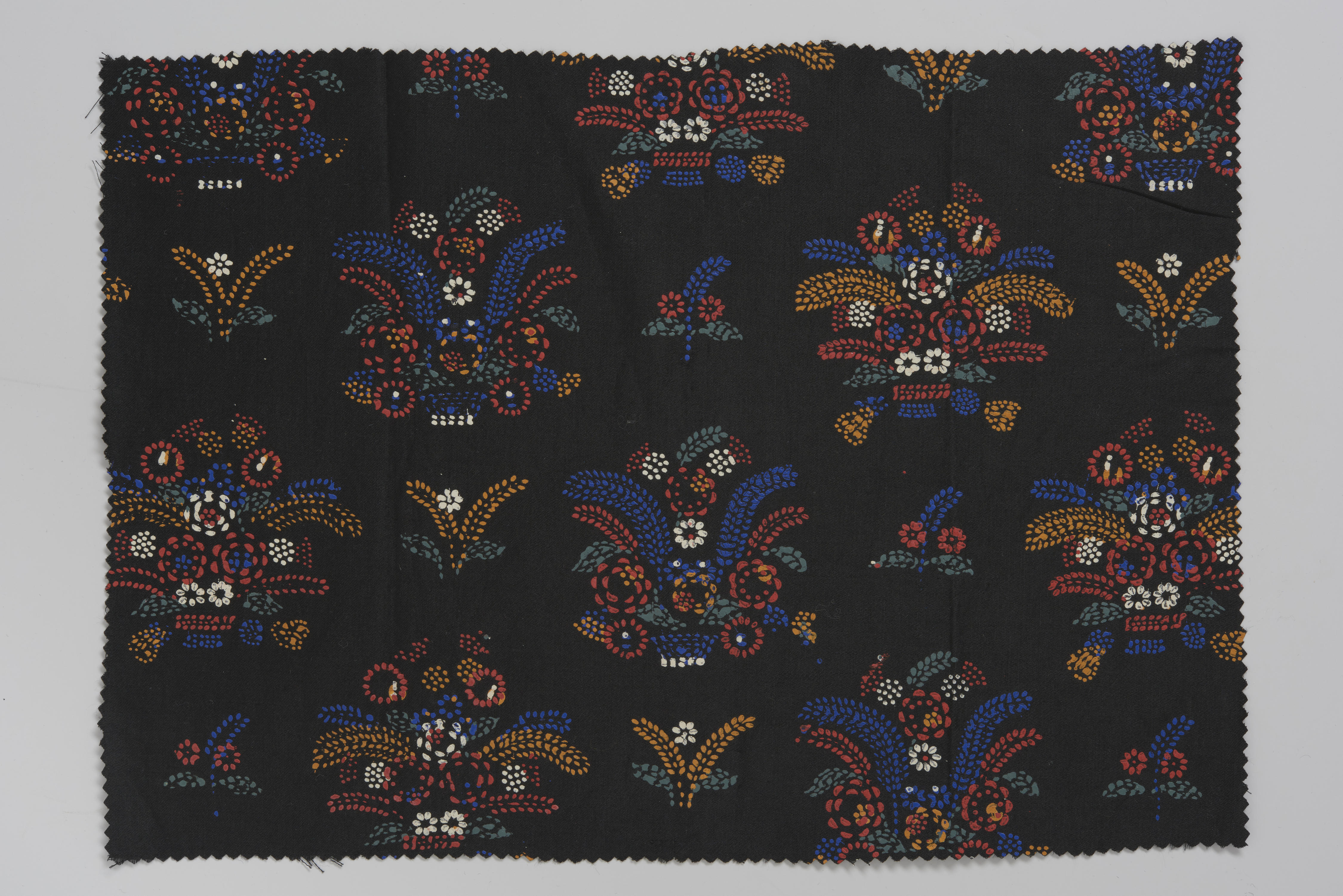 Zwart satijn met meerkleurig stipwerk, Staphorst, 19...