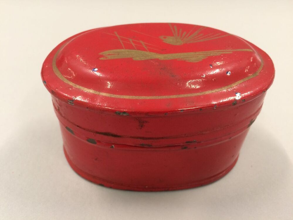 Rood blikken ovaalvormige theebus met goudkleurige t...