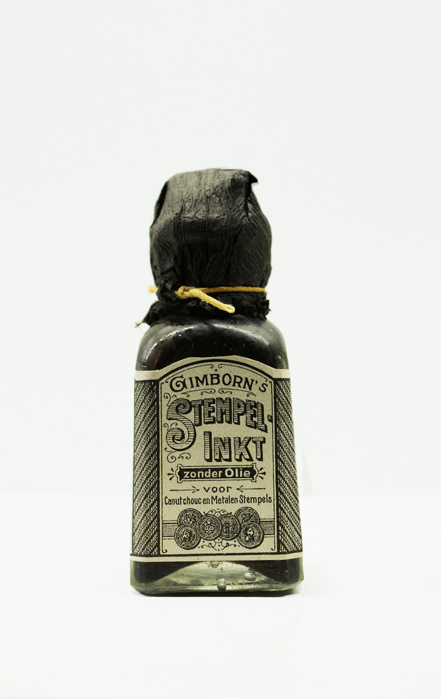 Inktfles van glas gevuld met stempelinkt door H. van...