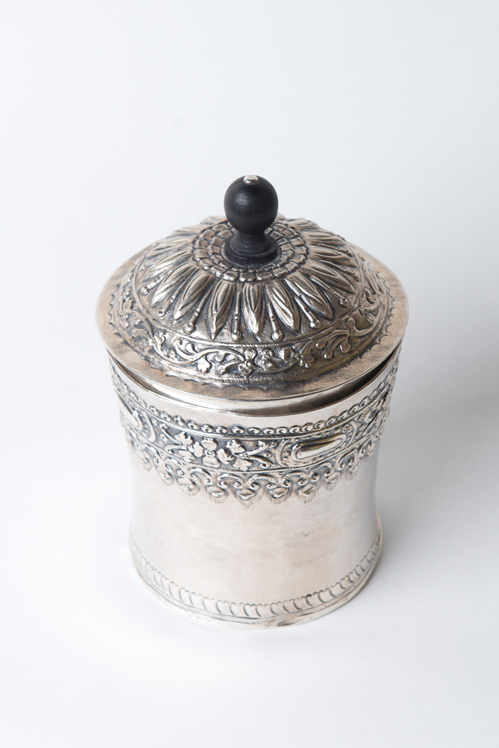 Het topstuk (zilveren theebusje) van Michael Driebee...