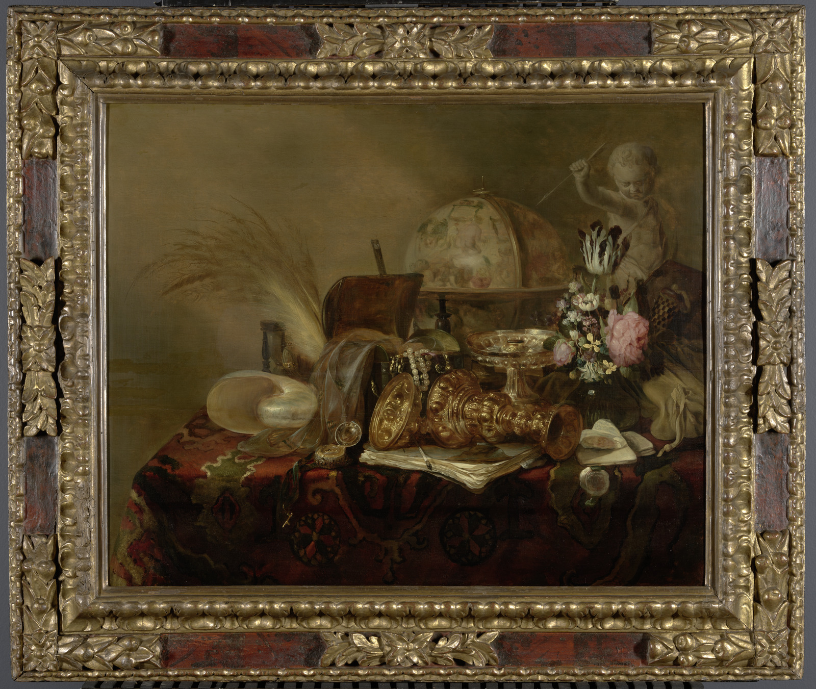 Stilleven met beeldje van Cupido, vaas met bloemen e...