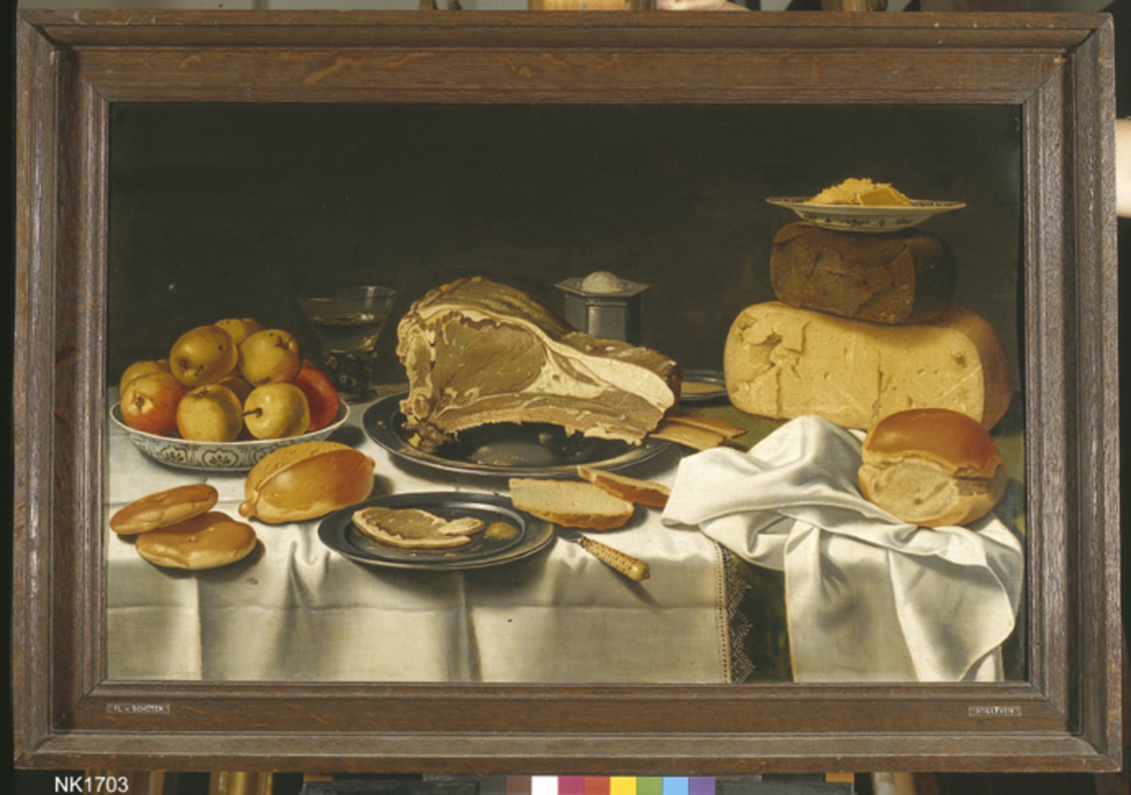 Stilleven met appels, gebraden vlees en kazen