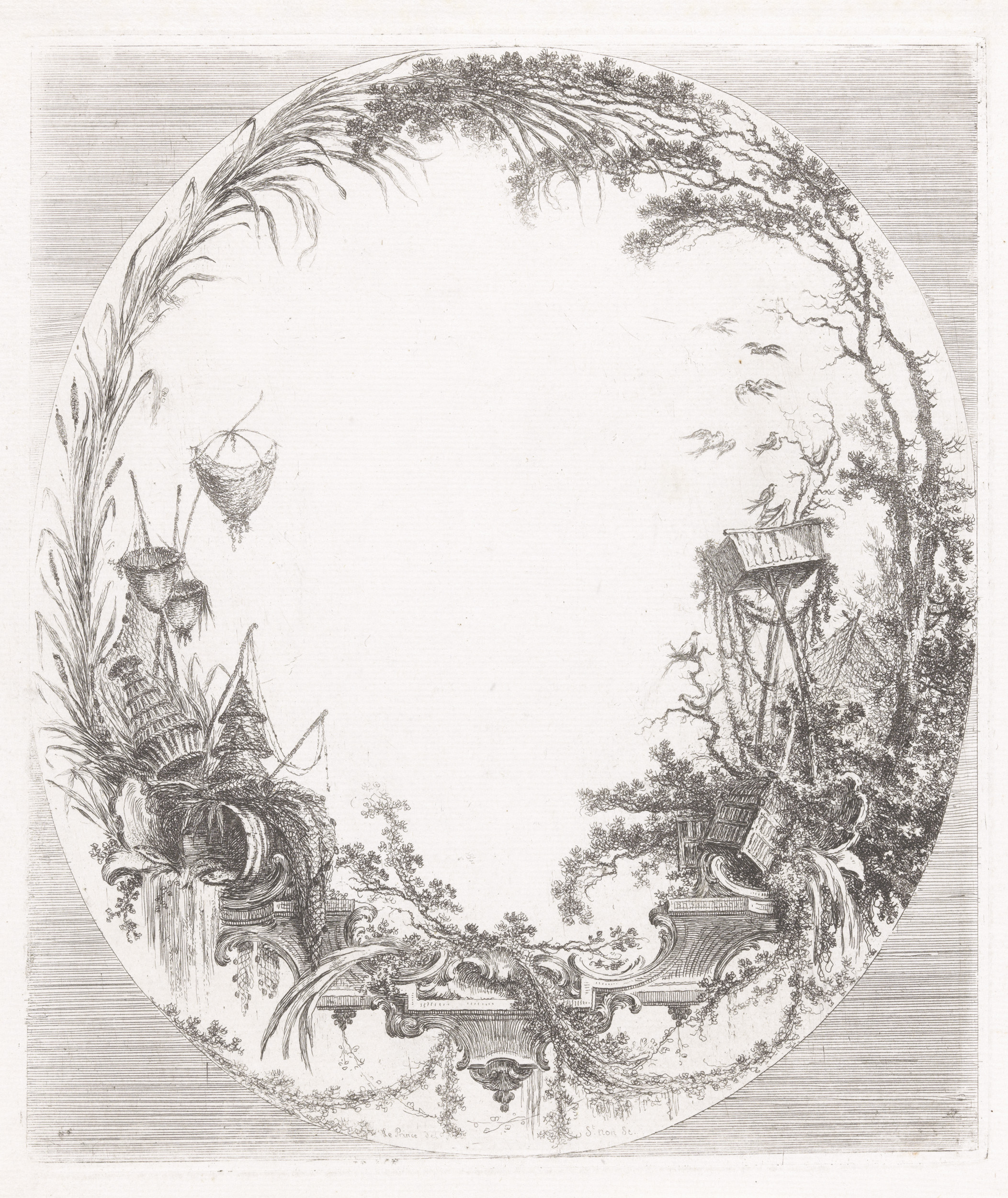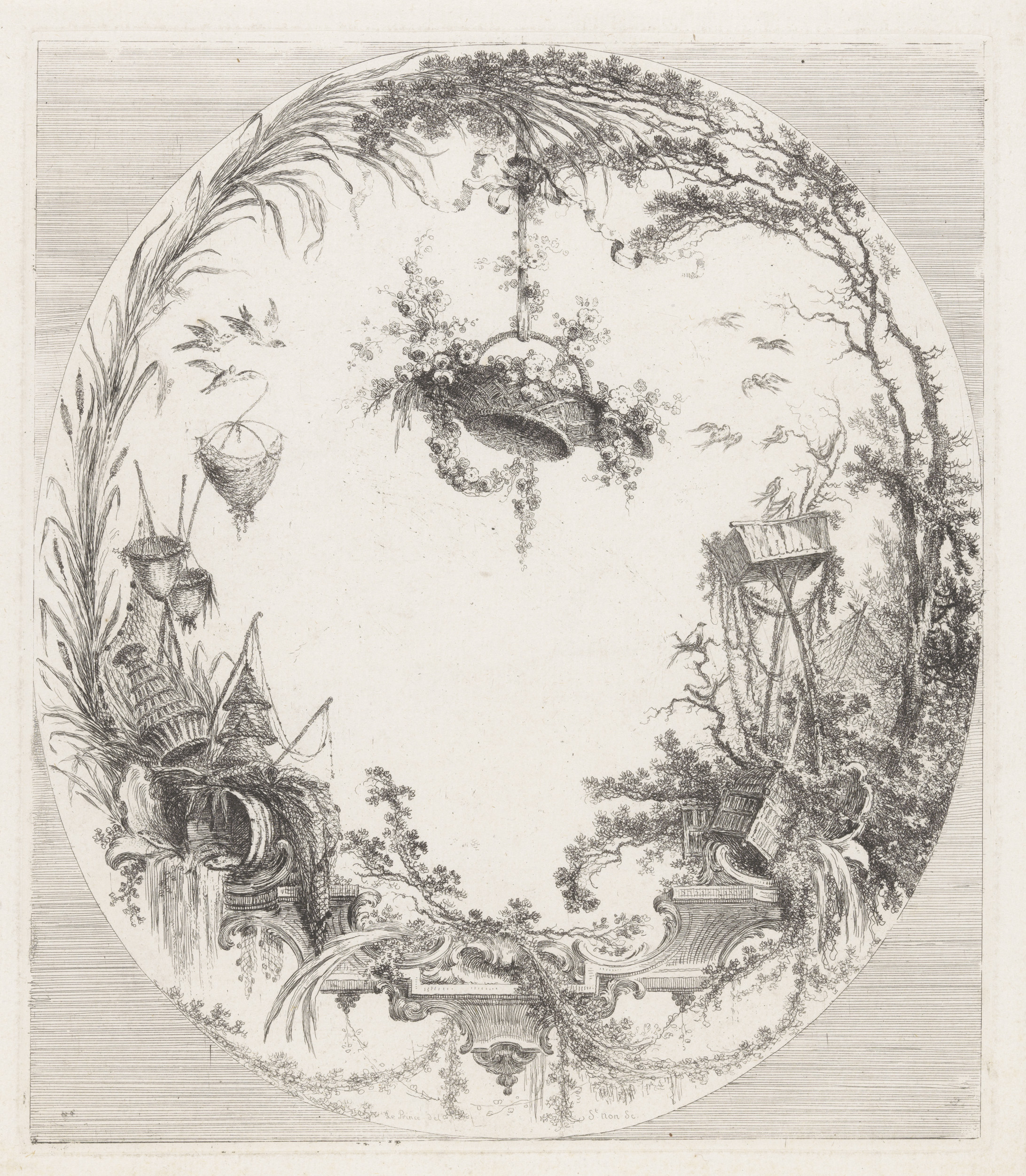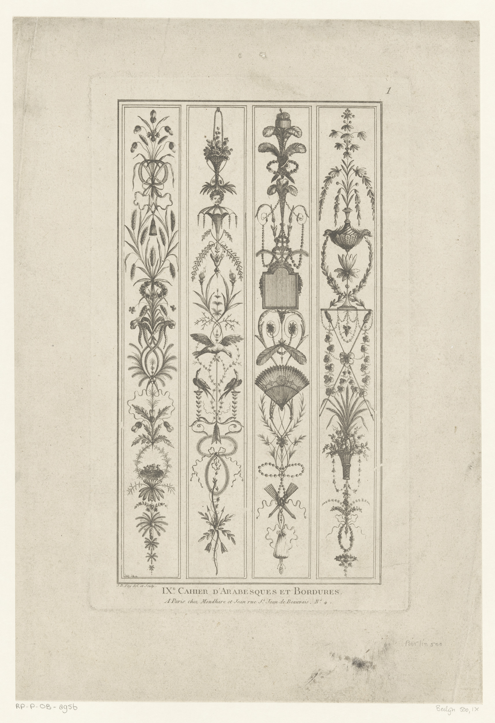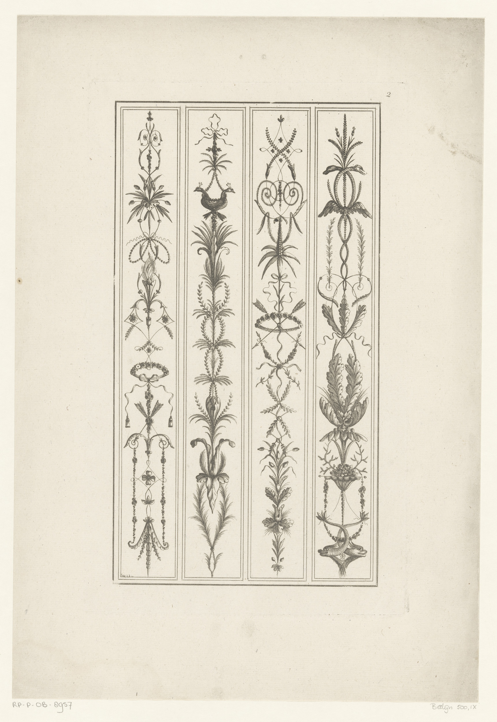 Arabesken met sikkels, vogels, waaier en vazen