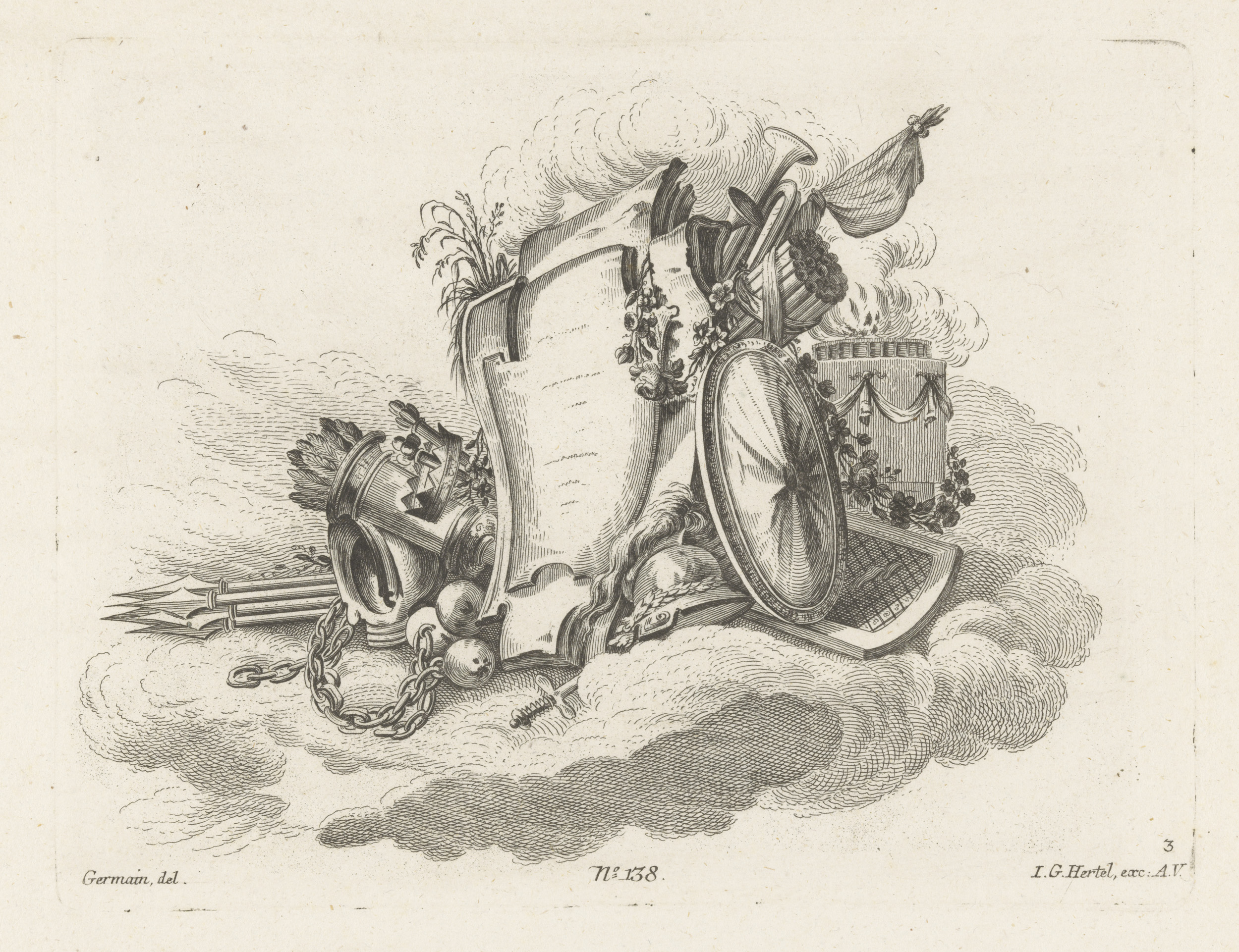 Arabesken met lier, zandloper, vaas en pijlen