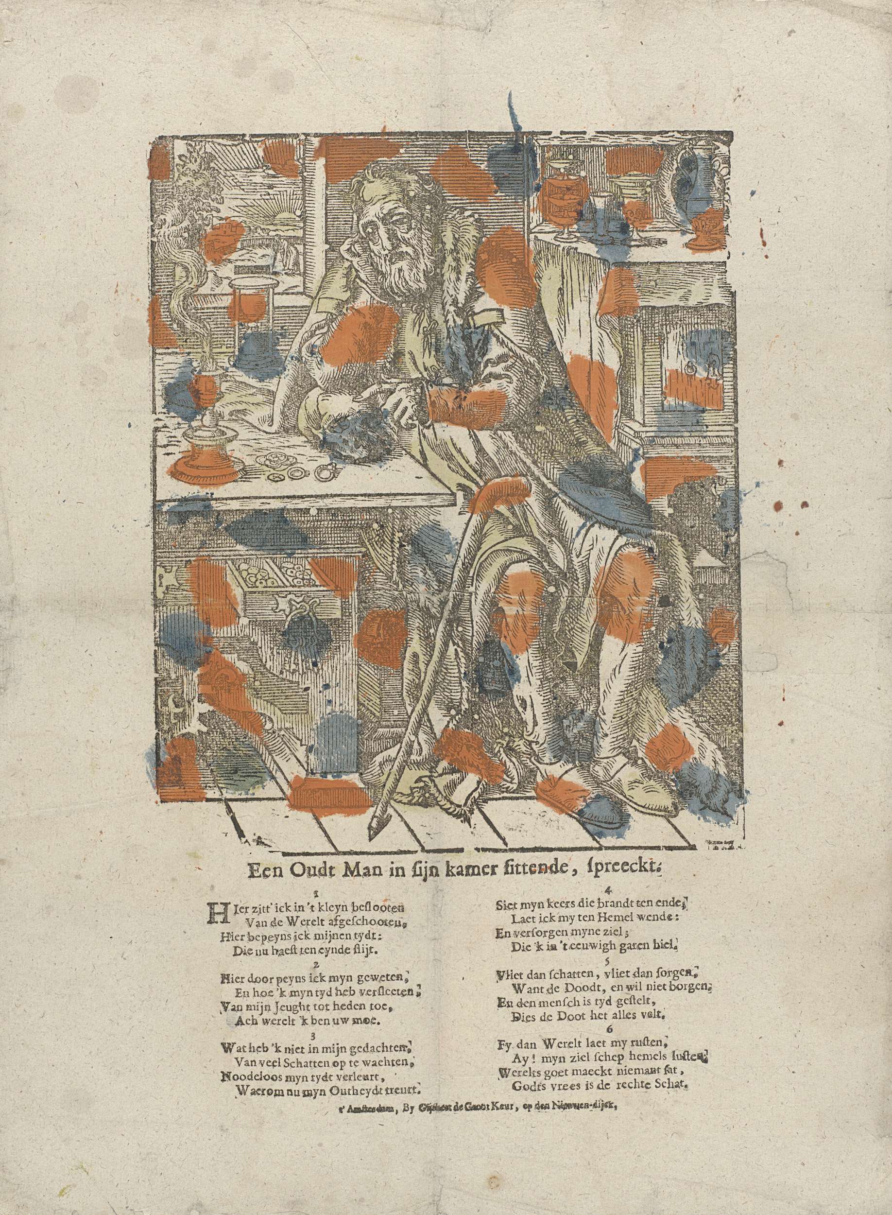 Een oudt man in sijn kamer sittende, spreeckt