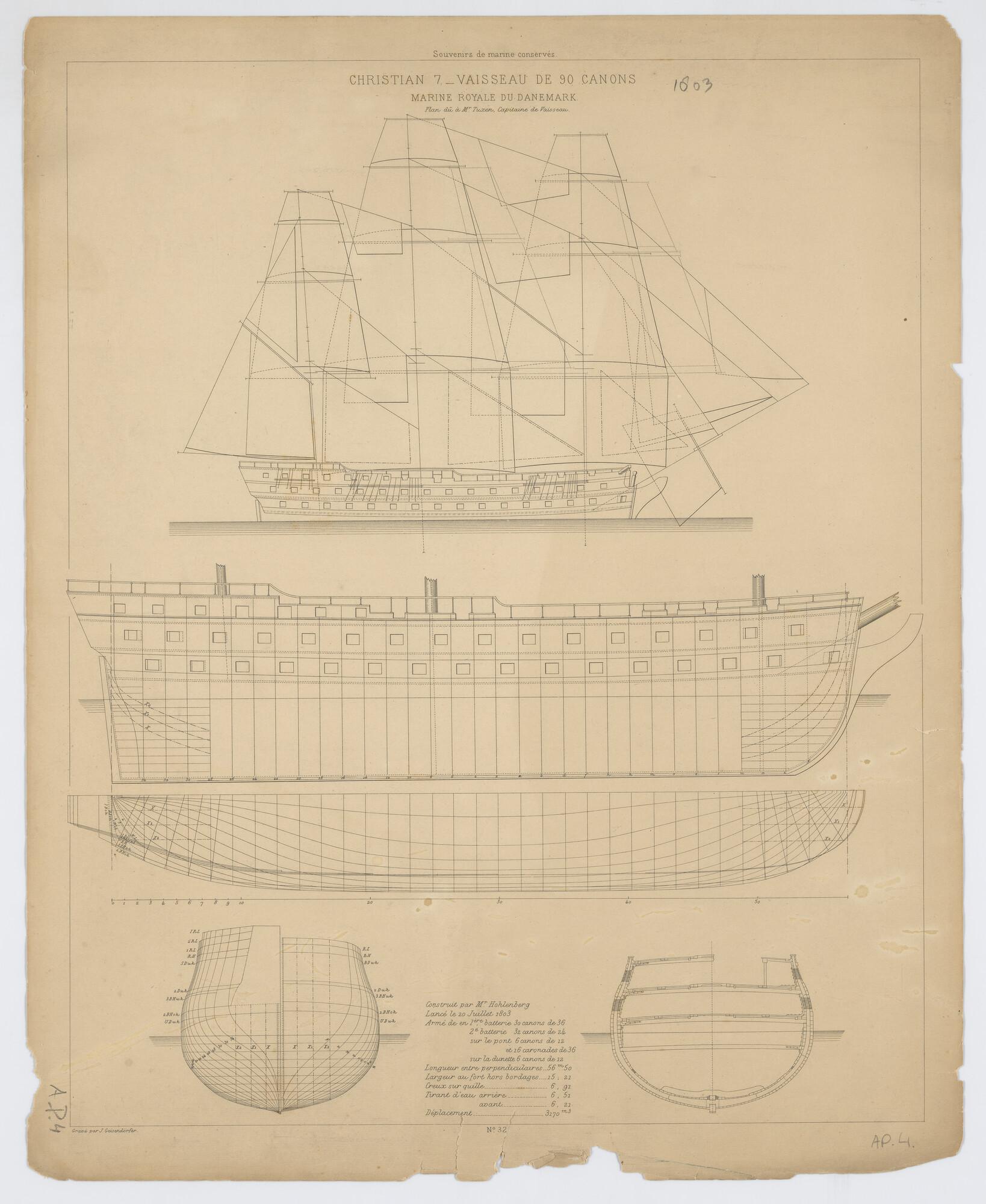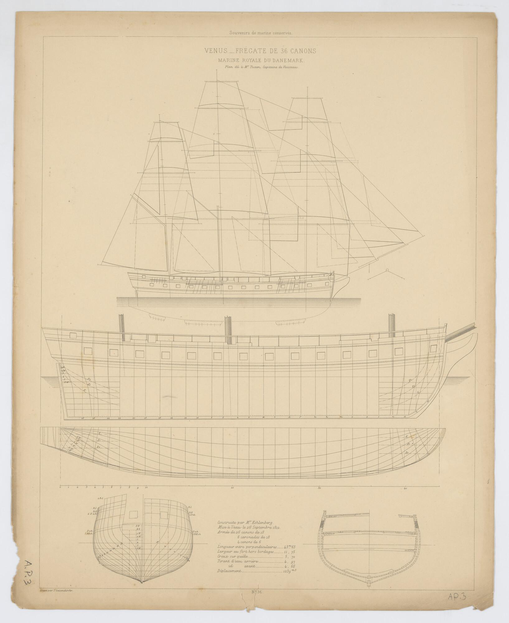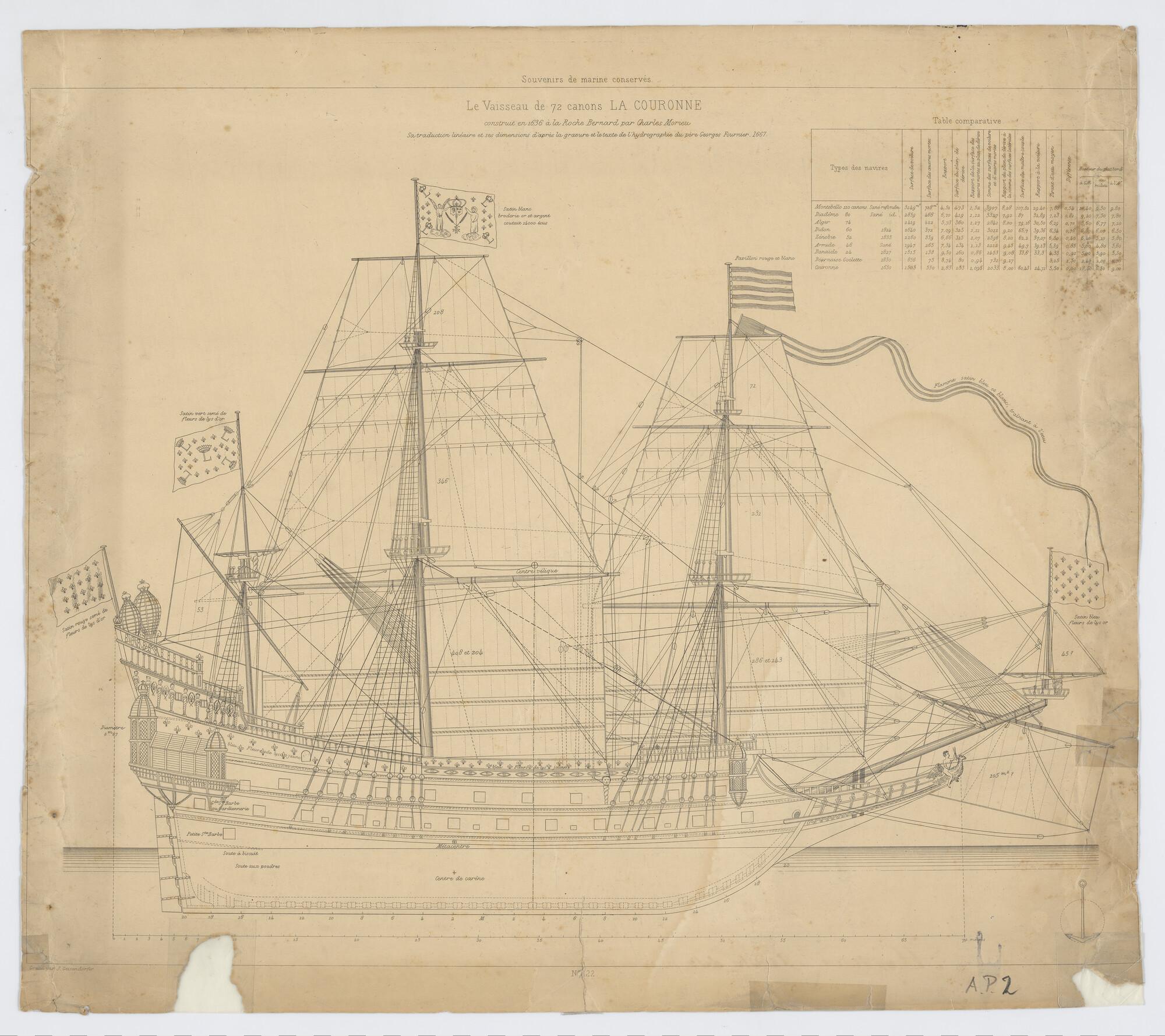 Zeil- en tuigplan van het Franse oorlogsschip La Cou...