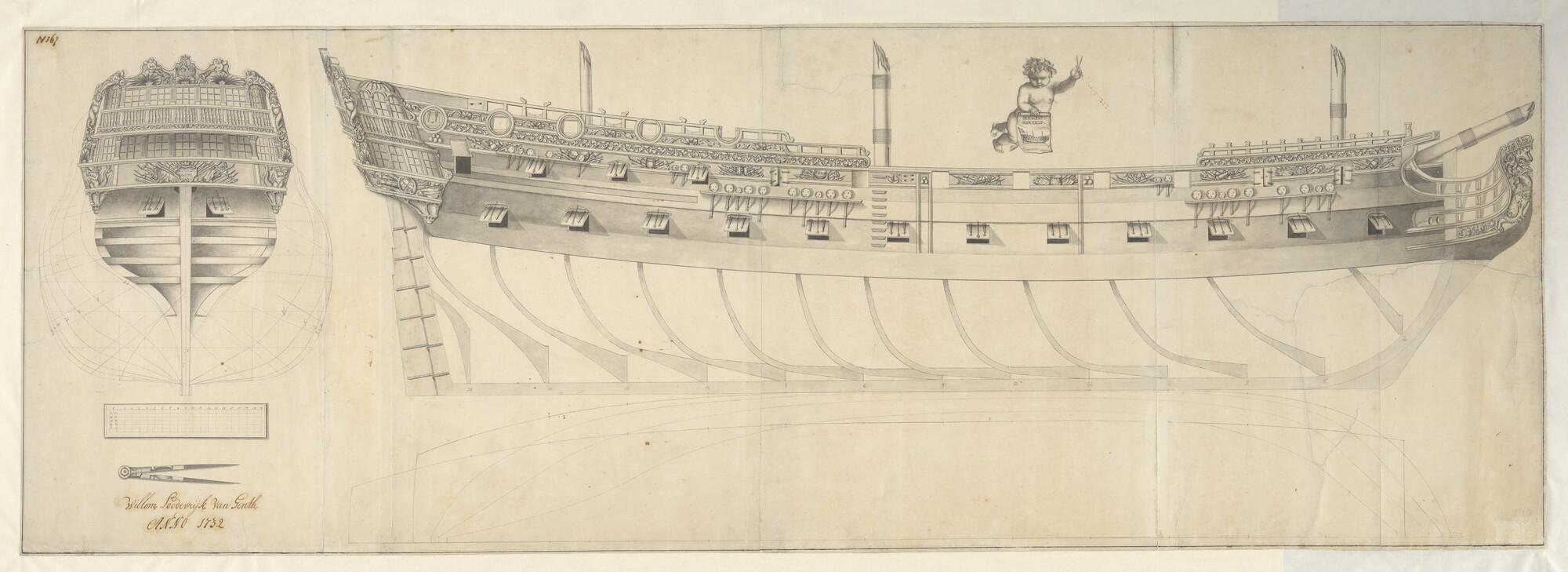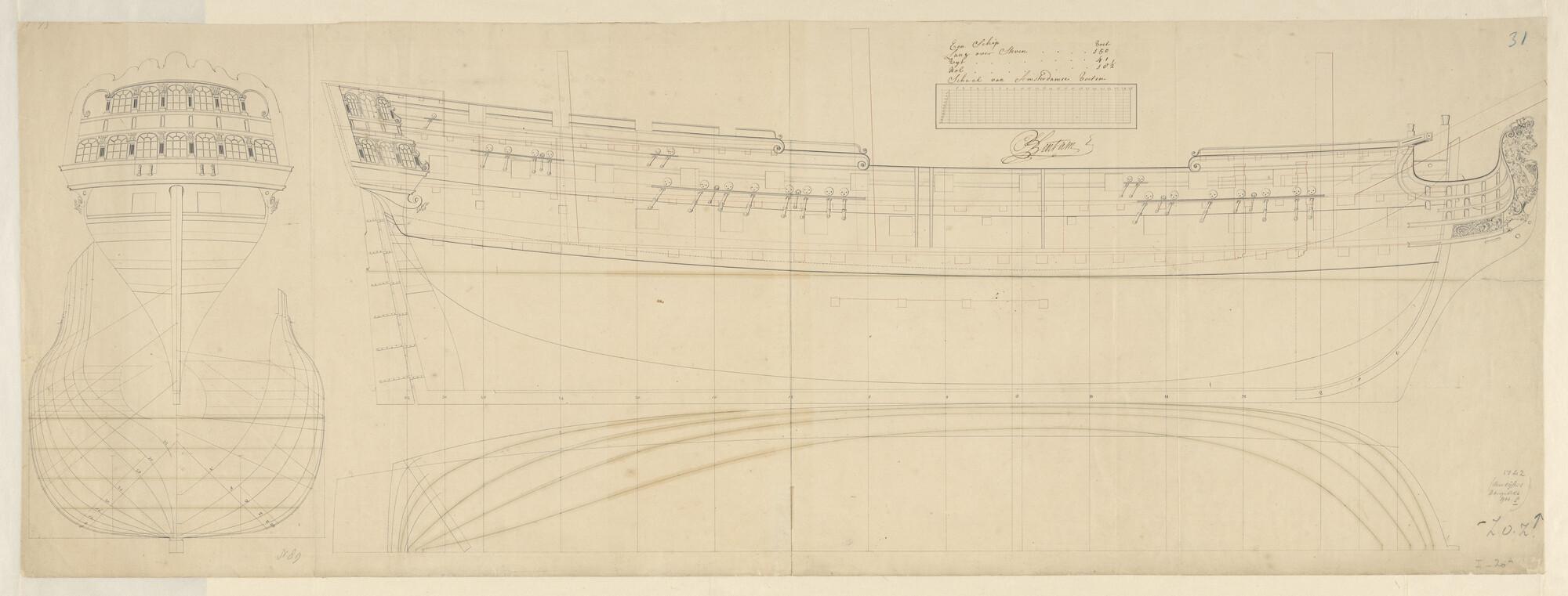 Spantenraam, waterlijnen, achter- en zijaanzicht van...