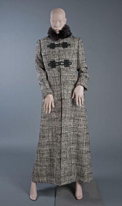 Maxi jas, voetlange mantel van zwart-wit wollen weef...
