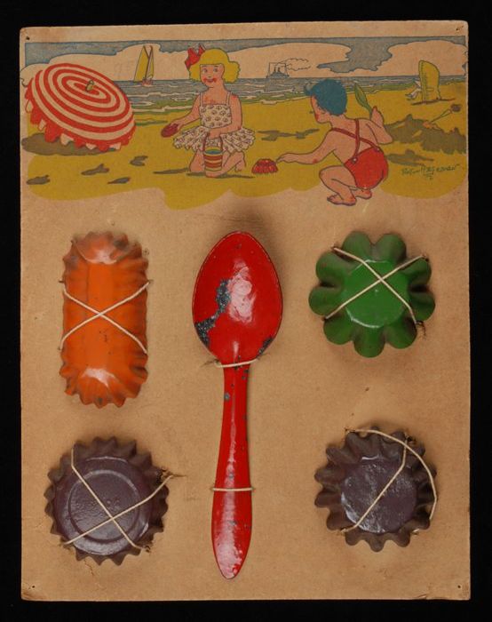Strandset met zandvormen en lepel
